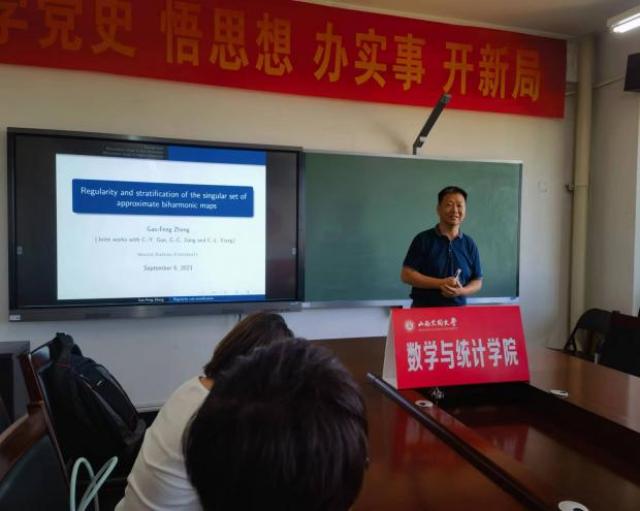 郑高峰教授先介绍近似双调和映射奇异集的正则性和分层性。主要介绍了问题的研究背景、研究历史状况及所做的主要工作及问题的特点、数学上的困难和工作的创新之处.最后郑高峰教授还热情地回答了我院年轻教师提出的若干问题,也希望青年教师多思考、多交流。