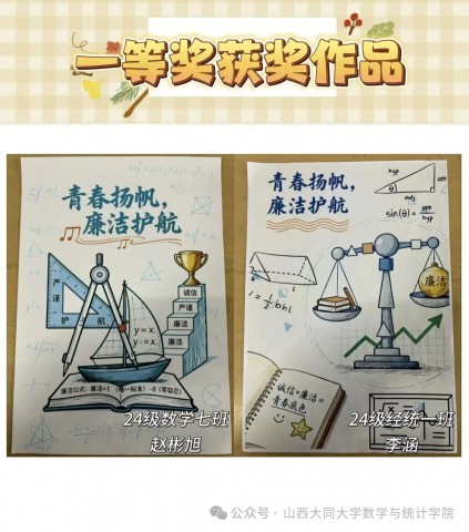 作品创作中,参赛选手紧扣廉洁核心主题,将函数图像、几何图形、数学公式等学科元素巧妙融入设计,凸显出了数学学科“严谨、诚信、廉洁”的内在特质,也实现了思想性与艺术性的深度融合,展现出数学学科广泛的应用场景,充分彰显了同学们的创新能力与知识储备,为学院文化建设增添亮色。