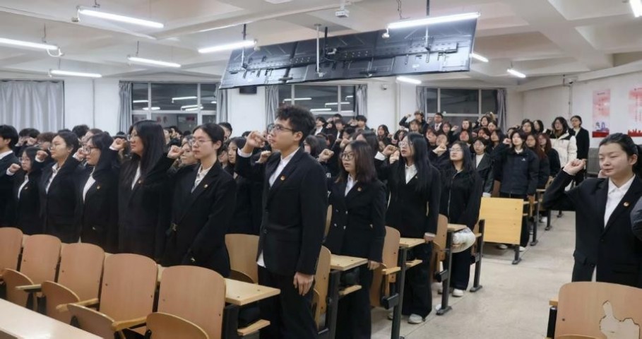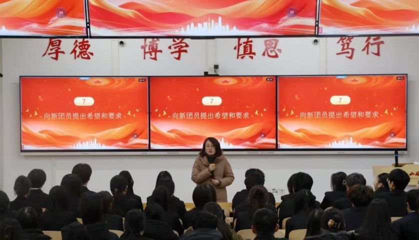 仪式在庄严的中华人民共和国国歌声中拉开帷幕。首先,主持人宣读了新团员名单,151 名同学经个人申请、班级推荐、学院团委审核,正式成为中国共产主义青年团团员。随后,刘霞和老团员代表为新团员佩戴团徽,在领誓人的带领下,全体新团员举起右拳,面向鲜艳的中国共产主义青年团团旗庄严宣誓,铿锵有力的誓言回荡在教室,表达了新团员们为共产主义事业奋斗的坚定决心。