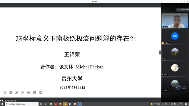 6月28日下午3点,贵州大学王锦荣教授应邀在腾讯会议作了题为“球坐标意义下南极绕极流问题解的存在性”的学术报告。我院二十余名教师和联合培养的硕士研究生听取了报告,报告会由科研部长康淑瑰教授主持。
