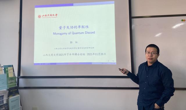 11月26日下午,郭钰在本真楼A305作了题为“量子失协的单配性”的学术讲座,学院部分相关研究方向教师和联合培养研究生听取了讲座。本次讲座为我校本学期“博士论坛”系列讲座之一。