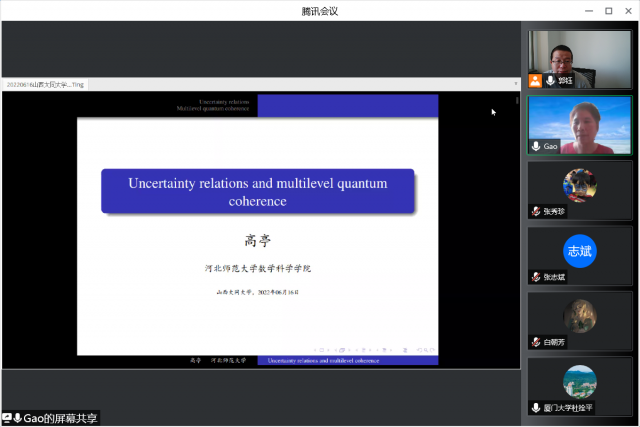 6月16日上午9:00,河北师范大学高亭教授应邀作了题为“Uncertainty relations and multilevel coherence”的线上学术讲座。我院以及兄弟院校50余名相关专业教师和部分联合培养的硕士研究生听取了讲座,报告会由副院长郭钰主持。