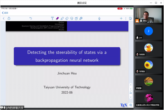 6月20日下午3:00,太原理工大学侯晋川教授应邀作了题为“Detecting the steerability of states via a backpropagation neural network”的线上学术讲座。我院50余名相关专业教师和部分联合培养的硕士研究生聆听了讲座,报告会由副院长郭钰主持。