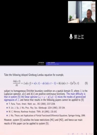 郭上江教授先介绍了一般巴拿赫空间中半线性泛函微分方程的等变范式。然后针对一般Banach空间中半线性FDEs的等变Hopf分岔定理,分岔周期解分支的存在性、稳定性和分岔方向的判据问题,做了系统而深刻的分析与介绍。随后通过介绍二维圆盘上的时滞Ginzburg-Landau方程的例子,使大家更好理解报告中提及的方法和理论。随后,部分教师和郭教授就报告中的问题开展了深入交流,大家表示非常高兴有机会认识郭教授,能及时了解了这么前沿的科学问题,并就下一步结合研究对象如何开展学术研究达成了高度契合。